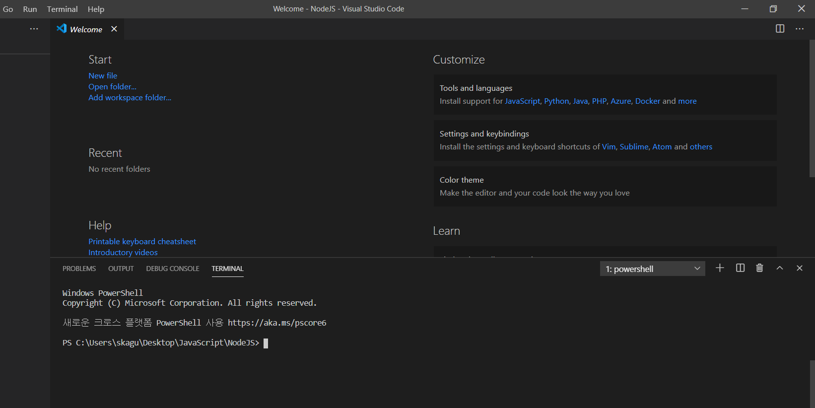 아래에 터미널이 나올텐데. 오른쪽에 세팅이 1 : powershell로 잡혀 있습니다.