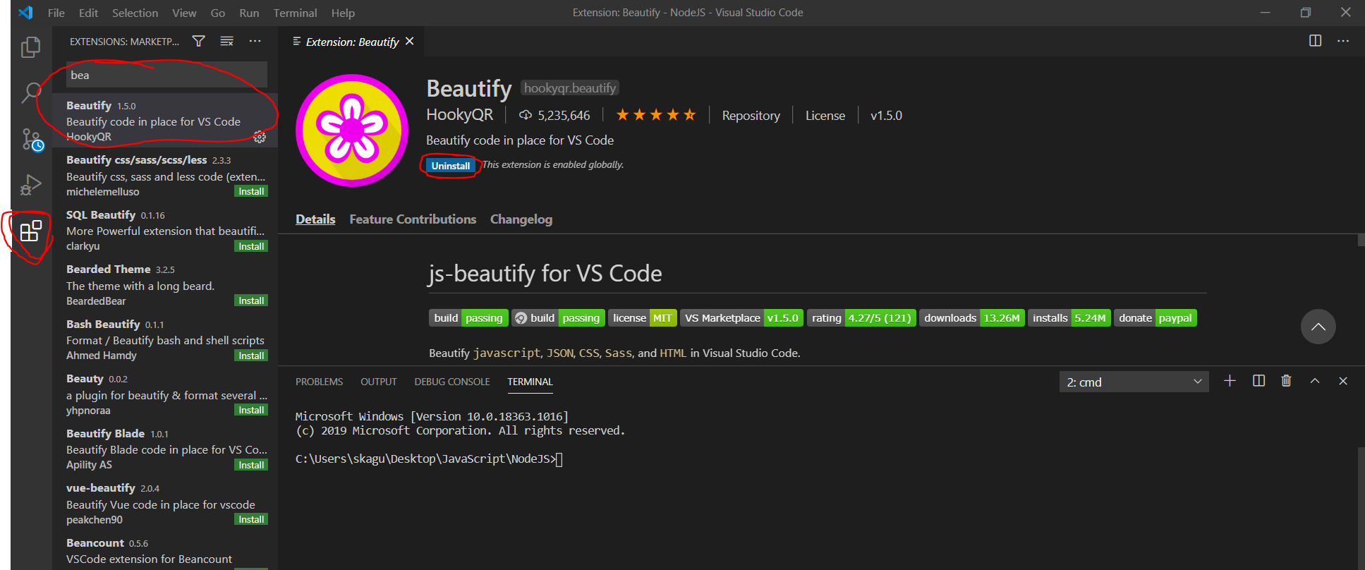 오른쪽 가장 아래 눌러주시고 beautify 검색 해주시면 위와 같이 나오구요.