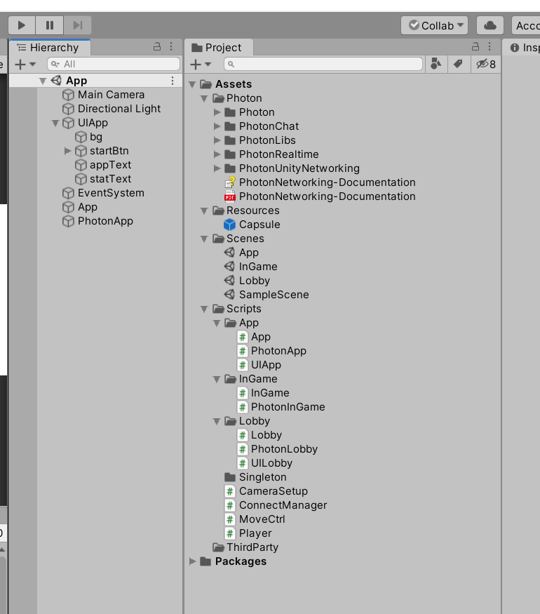PhotonApp => App에서 포톤에 연결할 네트워킹 담당하는 오브젝트 입니다. PhotonApp 스크립트 붙혔습니다.